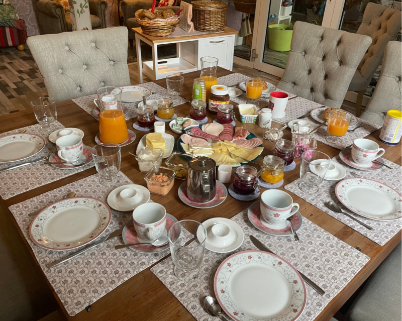 Wir nehmen gerne mit unseren Gästen zusammen das Frühstück ein. So finden wir einen schönen Bezug zueinander und vor allem lernen sich unsere Gäste untereinander kennen und manches mal entwickeln sich daraus auch Bekanntschaften oder sogar Freundschaften. Frühstückszeit ist meist um 08.30 Uhr, oder wir sprechen eine andere Zeit ab, zum Beispiel bei Kursbeginn um 09.00 Uhr fangen auch gern schon um 08.00 Uhr an .